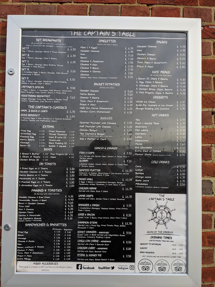 Welcome to The Captain's Table Cafe, located at 26 The Stade in Folkestone. This delightful cafe offers a diverse menu that caters to various tastes, making it an ideal spot for breakfast, lunch, or a sweet treat. The breakfast selection includes hearty options like the Captain’s Breakfast, which promises generous portion sizes that leave diners satisfied.
